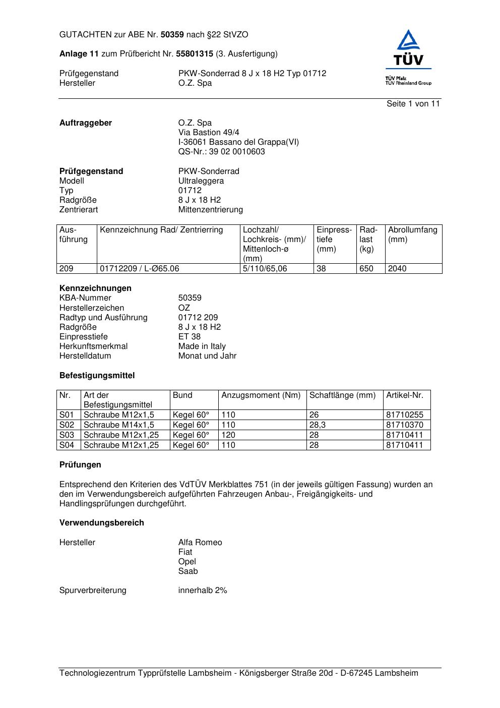 Dieses Gutachten (abe) bezieht sich auf die Alufelge O.Z. Spa 01712 in der Ausführung ET 0, Mittenloch 0 mm (KBA 50359). Im PDF findest du typischerweise zulässige Reifengrößen, Auflagen/Anbauhinweise und – je nach Dokument – Hinweise zur Eintragung.