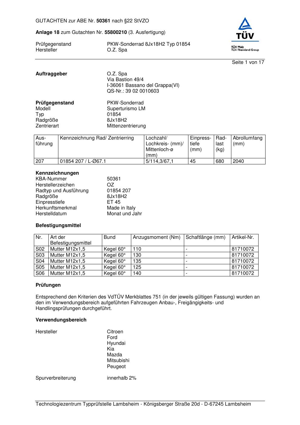Felgengutachten / abe für Alufelgen O.Z. Spa 01854 (ET 0, Mittenloch 0 mm) mit KBA 50361 (Zertifikatsnummer 50361). Hier kostenlos als PDF herunterladen. Der Download-Link ist 24 Stunden gültig und kann bis zu zwei Mal verwendet werden.