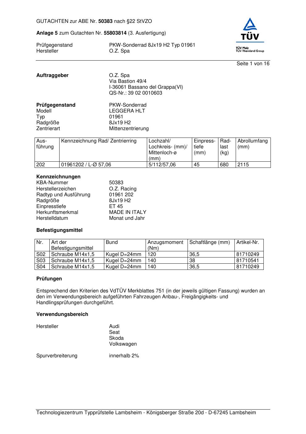 Felgengutachten / abe für Alufelgen O.Z. Spa 01961 (ET 0, Mittenloch 0 mm) mit KBA 50383 (Zertifikatsnummer 50383). Hier kostenlos als PDF herunterladen. Der Download-Link ist 24 Stunden gültig und kann bis zu zwei Mal verwendet werden.