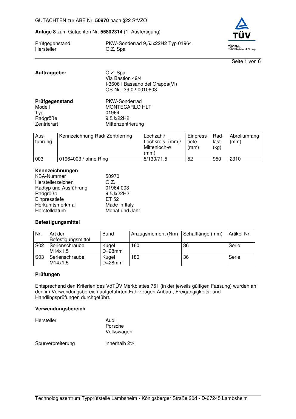 Dieses Gutachten (abe) bezieht sich auf die Alufelge O.Z. Spa 01964 in der Ausführung ET 0, Mittenloch 0 mm (KBA 50970). Im PDF findest du typischerweise zulässige Reifengrößen, Auflagen/Anbauhinweise und – je nach Dokument – Hinweise zur Eintragung.