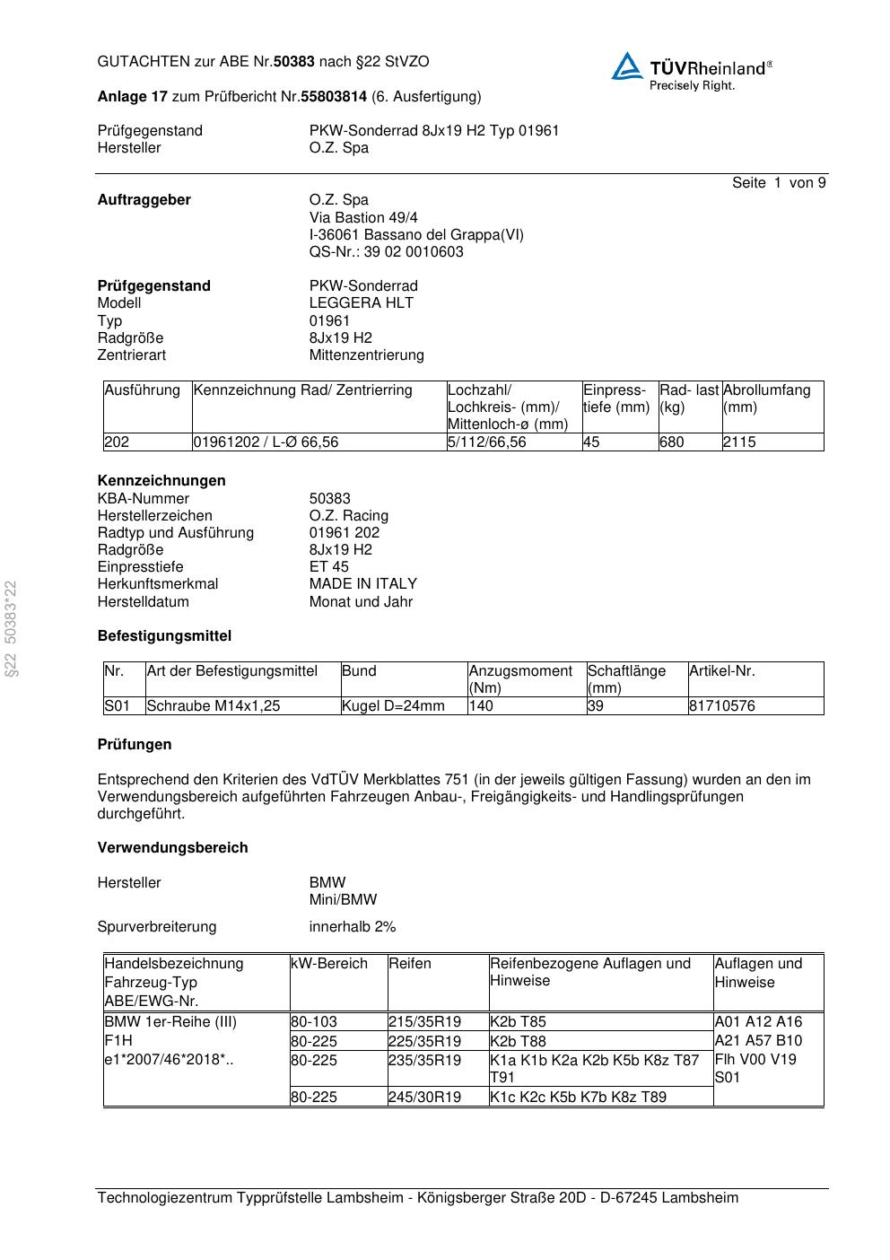 Dieses Gutachten (abe) bezieht sich auf die Alufelge O.Z. Spa (Herstellerzeichen: O.Z. Racing) 01961 in der Ausführung ET 0, Mittenloch 0 mm (KBA 50383). Im PDF findest du typischerweise zulässige Reifengrößen, Auflagen/Anbauhinweise und – je nach Dokument – Hinweise zur Eintragung.