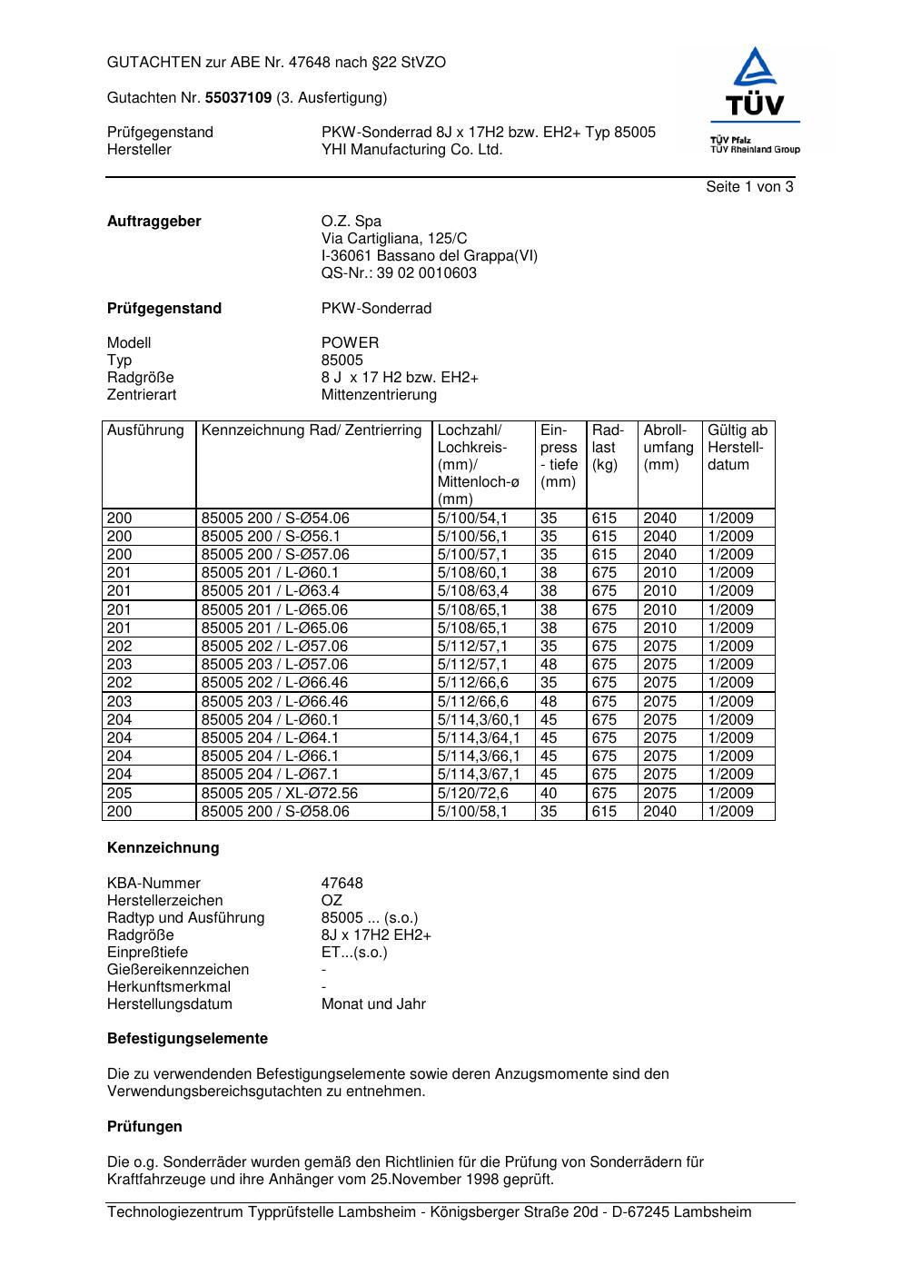 Dieses Gutachten (abe) bezieht sich auf die Alufelge OZ (O.Z. Spa) - manufactured by YHI Manufacturing Co. Ltd. 85005 in der Ausführung ET 0, Mittenloch 0 mm (KBA 47648). Im PDF findest du typischerweise zulässige Reifengrößen, Auflagen/Anbauhinweise und – je nach Dokument – Hinweise zur Eintragung.