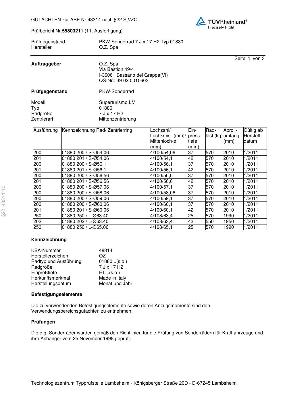 Felgengutachten / abe für Alufelgen O.Z. Spa 01880 (ET 0, Mittenloch 0 mm) mit KBA 48314 (Zertifikatsnummer 48314). Hier kostenlos als PDF herunterladen. Der Download-Link ist 24 Stunden gültig und kann bis zu zwei Mal verwendet werden.