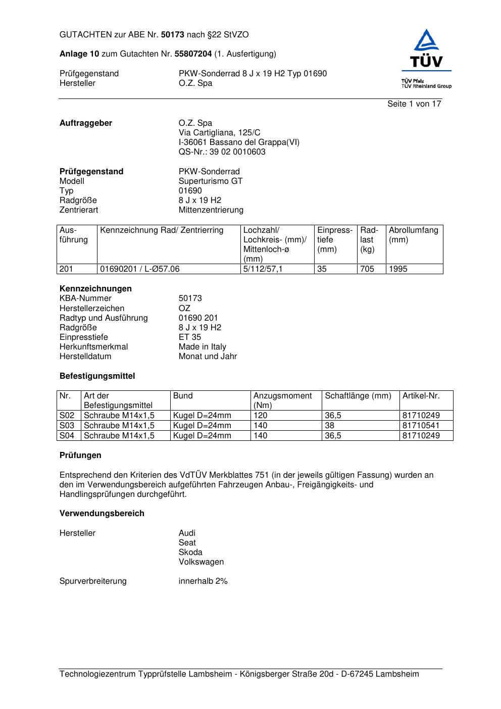 Dieses Gutachten (abe) bezieht sich auf die Alufelge O.Z. Spa 01690 in der Ausführung ET 0, Mittenloch 0 mm (KBA 50173). Im PDF findest du typischerweise zulässige Reifengrößen, Auflagen/Anbauhinweise und – je nach Dokument – Hinweise zur Eintragung.