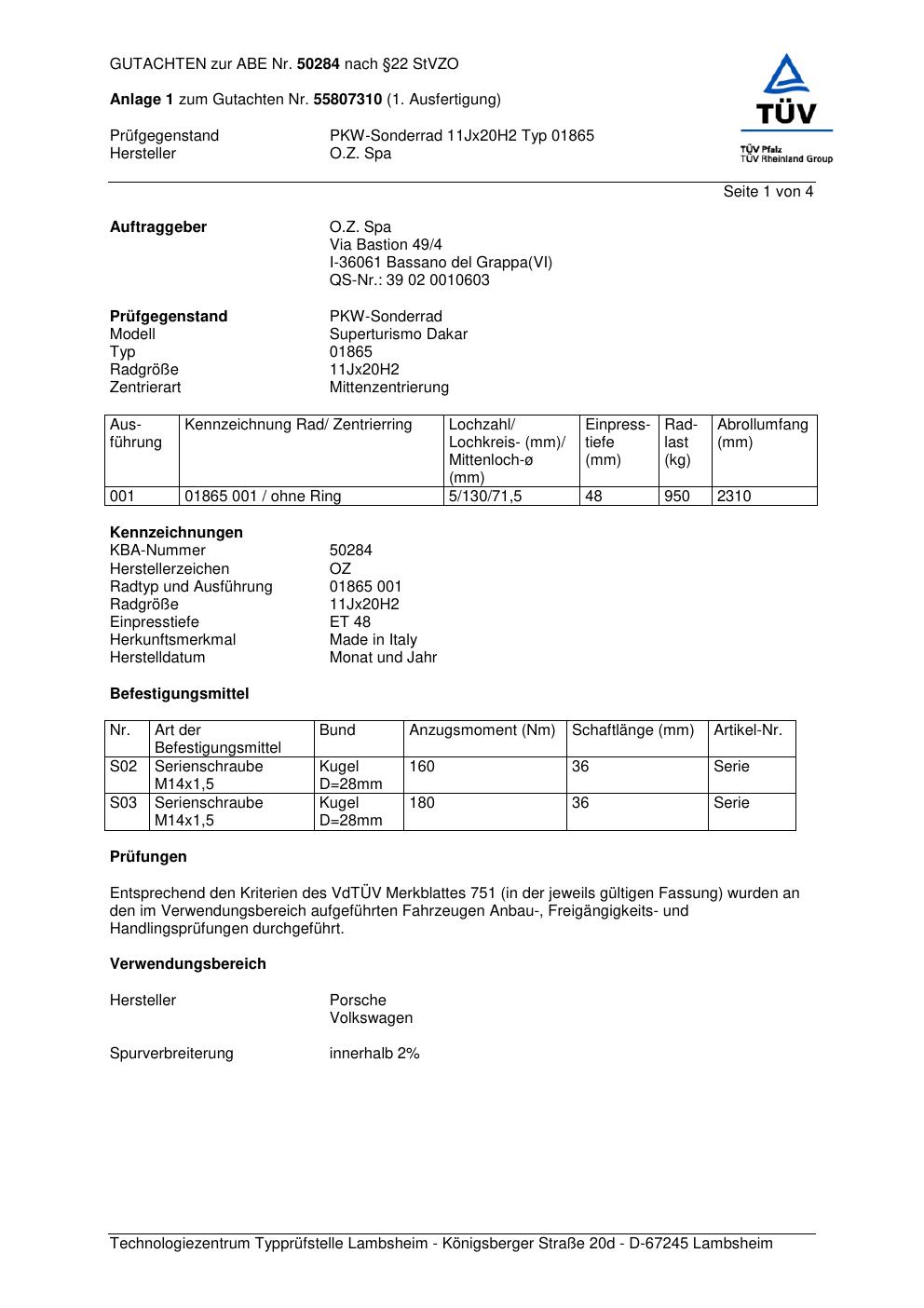 Felgengutachten / abe für Alufelgen O.Z. Spa 01865 (ET 0, Mittenloch 0 mm) mit KBA 50284 (Zertifikatsnummer 50284). Hier kostenlos als PDF herunterladen. Der Download-Link ist 24 Stunden gültig und kann bis zu zwei Mal verwendet werden.