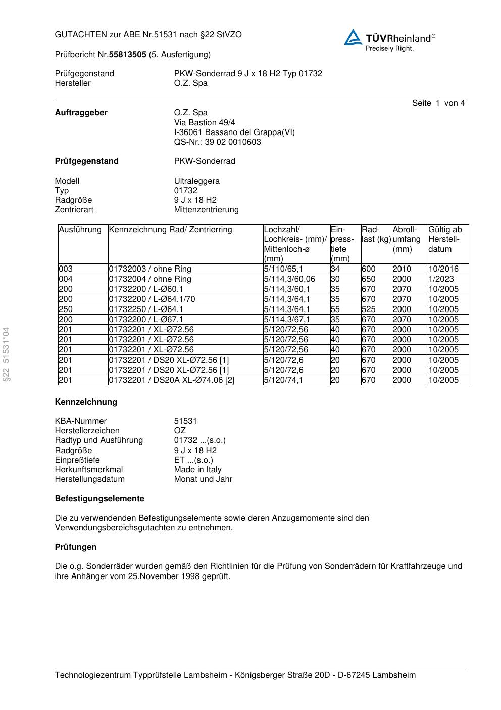 Felgengutachten / abe für Alufelgen O.Z. Spa 01732 (ET 0, Mittenloch 0 mm) mit KBA 51531 (Zertifikatsnummer 51531). Hier kostenlos als PDF herunterladen. Der Download-Link ist 24 Stunden gültig und kann bis zu zwei Mal verwendet werden.