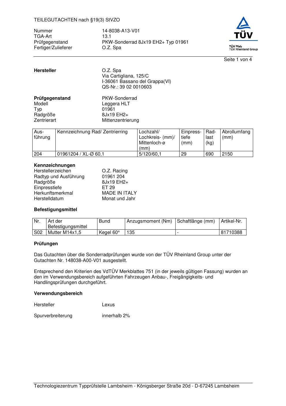 teilegutachten 14-8038-a13-v01 O.Z. Racing (O.Z. Spa) 01961