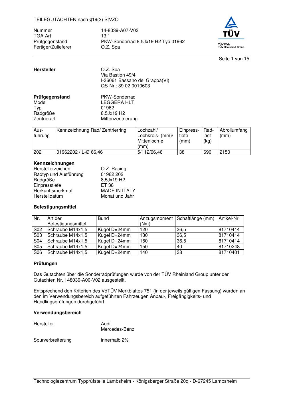 teilegutachten 14-8039-a07-v03 O.Z. Racing (O.Z. Spa) 01962