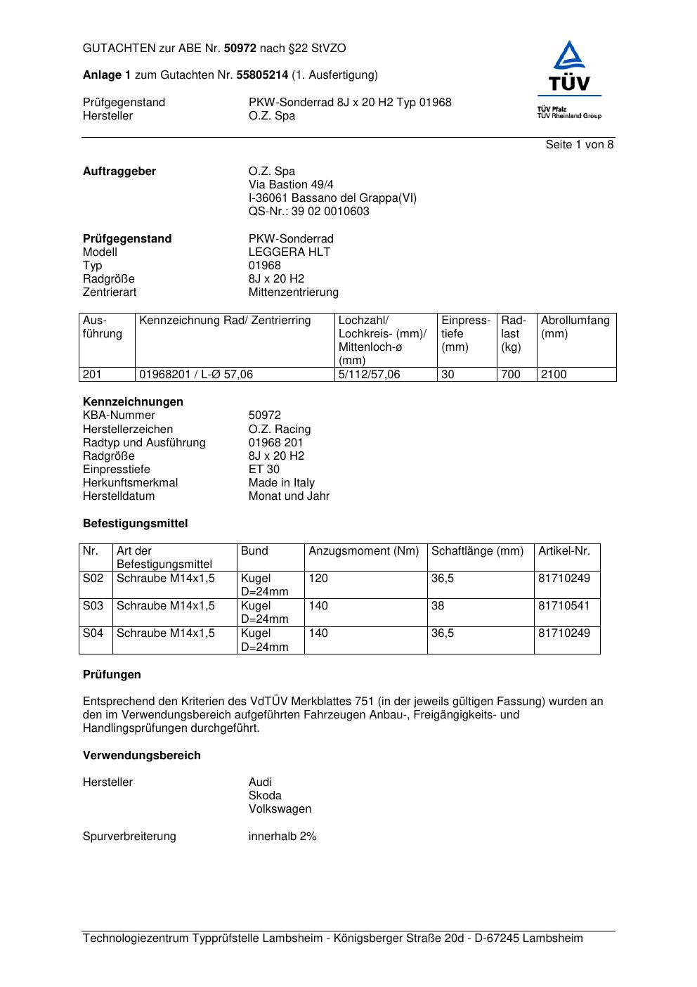 Dieses Gutachten (abe) bezieht sich auf die Alufelge O.Z. Racing 01968 in der Ausführung ET 0, Mittenloch 0 mm (KBA 50972). Im PDF findest du typischerweise zulässige Reifengrößen, Auflagen/Anbauhinweise und – je nach Dokument – Hinweise zur Eintragung.