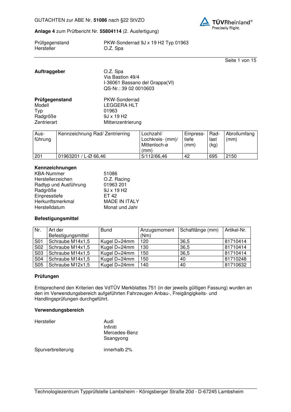 Felgengutachten / abe für Alufelgen O.Z. Racing 01963 (ET 0, Mittenloch 0 mm) mit KBA 51086 (Zertifikatsnummer 51086). Hier kostenlos als PDF herunterladen. Der Download-Link ist 24 Stunden gültig und kann bis zu zwei Mal verwendet werden.