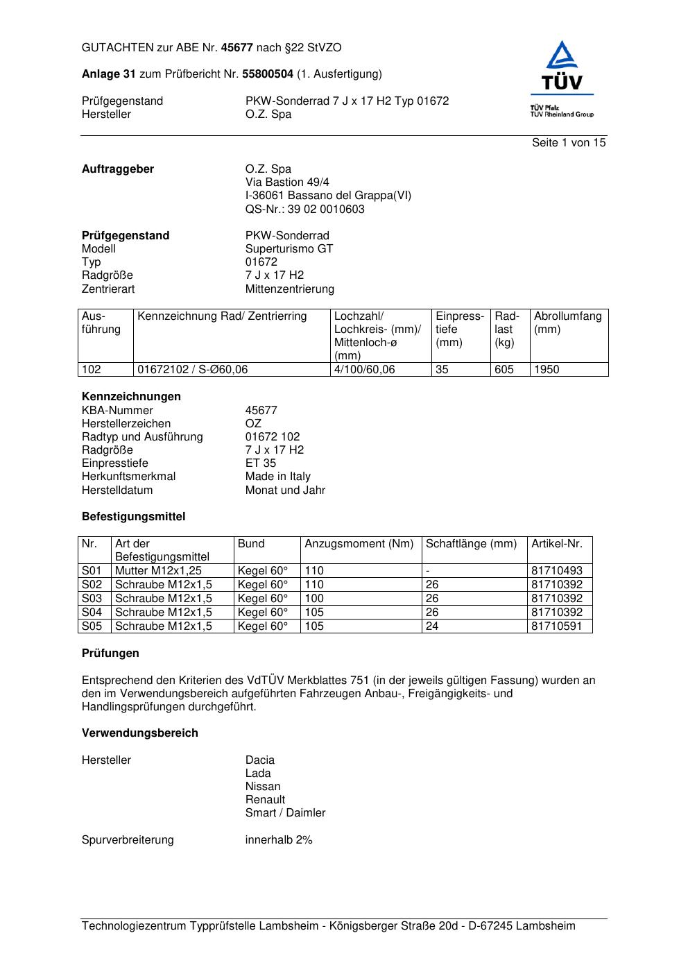 Dieses Gutachten (abe) bezieht sich auf die Alufelge O.Z. Racing 01672 in der Ausführung ET 0, Mittenloch 0 mm (KBA 45677). Im PDF findest du typischerweise zulässige Reifengrößen, Auflagen/Anbauhinweise und – je nach Dokument – Hinweise zur Eintragung.