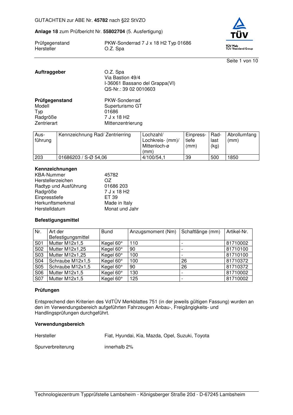 Dieses Gutachten (abe) bezieht sich auf die Alufelge O.Z. Racing 01686 in der Ausführung ET 0, Mittenloch 0 mm (KBA 45782). Im PDF findest du typischerweise zulässige Reifengrößen, Auflagen/Anbauhinweise und – je nach Dokument – Hinweise zur Eintragung.