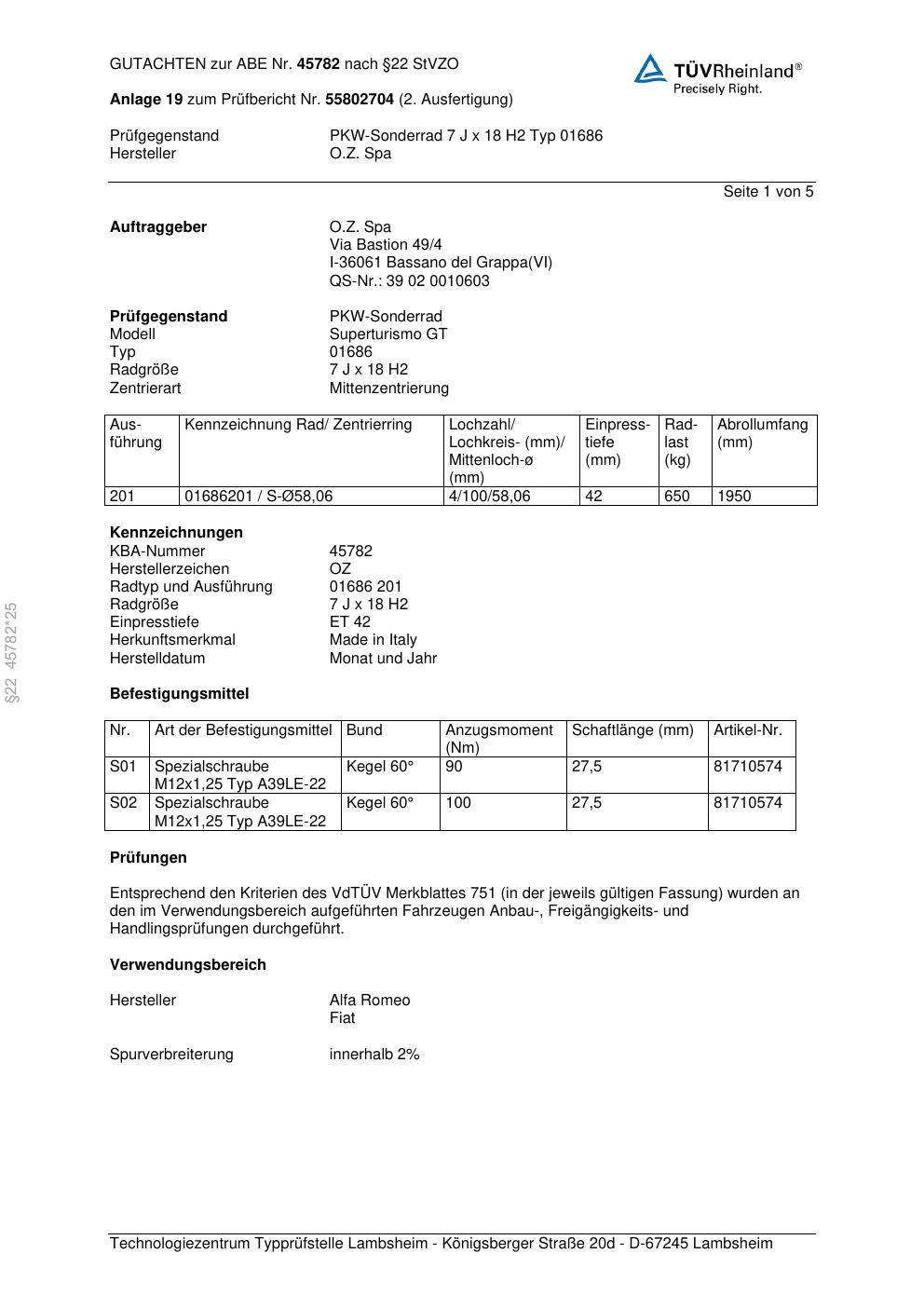Dieses Gutachten (abe) bezieht sich auf die Alufelge O.Z. Racing 01686 in der Ausführung ET 0, Mittenloch 0 mm (KBA 45782). Im PDF findest du typischerweise zulässige Reifengrößen, Auflagen/Anbauhinweise und – je nach Dokument – Hinweise zur Eintragung.