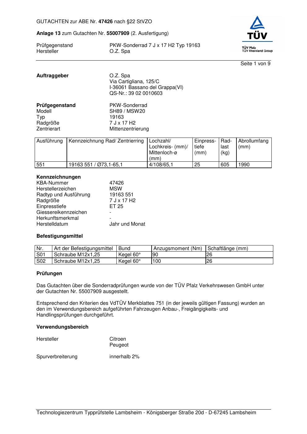 Dieses Gutachten (abe) bezieht sich auf die Alufelge O.Z. Spa 19163 in der Ausführung ET 0, Mittenloch 0 mm (KBA 47426). Im PDF findest du typischerweise zulässige Reifengrößen, Auflagen/Anbauhinweise und – je nach Dokument – Hinweise zur Eintragung.