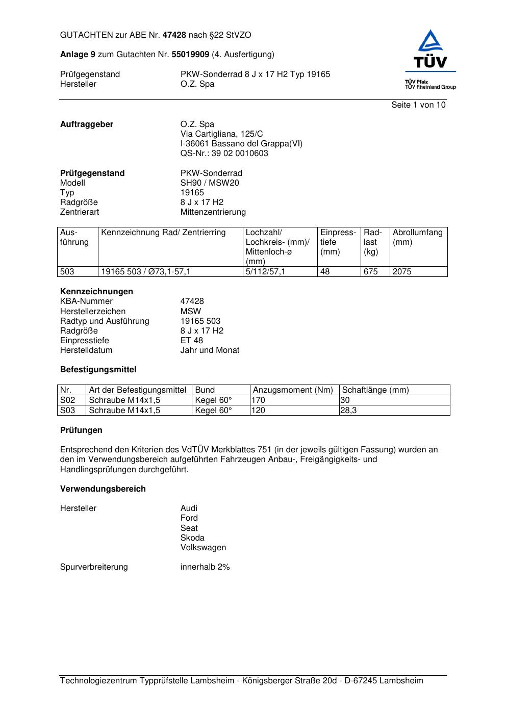 Dieses Gutachten (abe) bezieht sich auf die Alufelge O.Z. Spa 19165 in der Ausführung ET 0, Mittenloch 0 mm (KBA 47428). Im PDF findest du typischerweise zulässige Reifengrößen, Auflagen/Anbauhinweise und – je nach Dokument – Hinweise zur Eintragung.