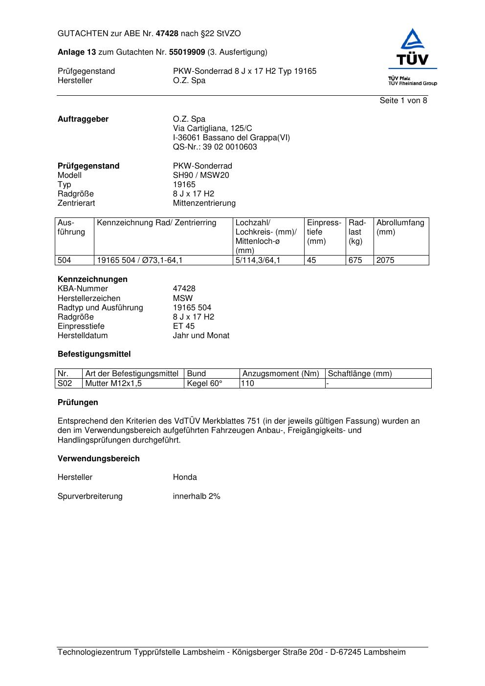 Dieses Gutachten (abe) bezieht sich auf die Alufelge O.Z. Spa 19165 in der Ausführung ET 0, Mittenloch 0 mm (KBA 47428). Im PDF findest du typischerweise zulässige Reifengrößen, Auflagen/Anbauhinweise und – je nach Dokument – Hinweise zur Eintragung.