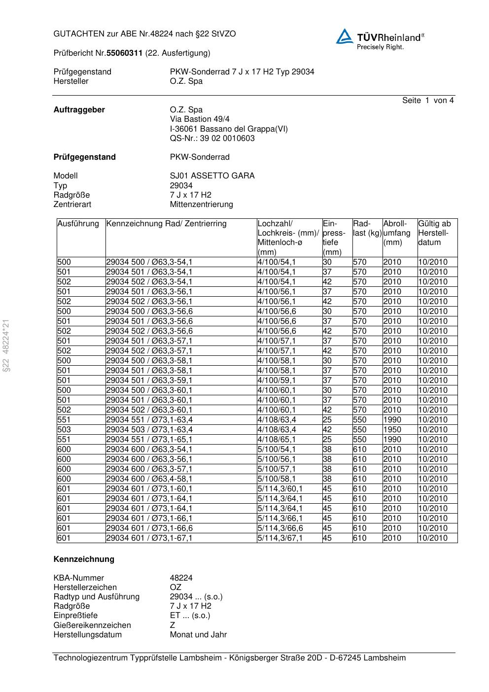 Dieses Gutachten (abe) bezieht sich auf die Alufelge O.Z. Spa 29034 in der Ausführung ET 0, Mittenloch 0 mm (KBA 48224). Im PDF findest du typischerweise zulässige Reifengrößen, Auflagen/Anbauhinweise und – je nach Dokument – Hinweise zur Eintragung.