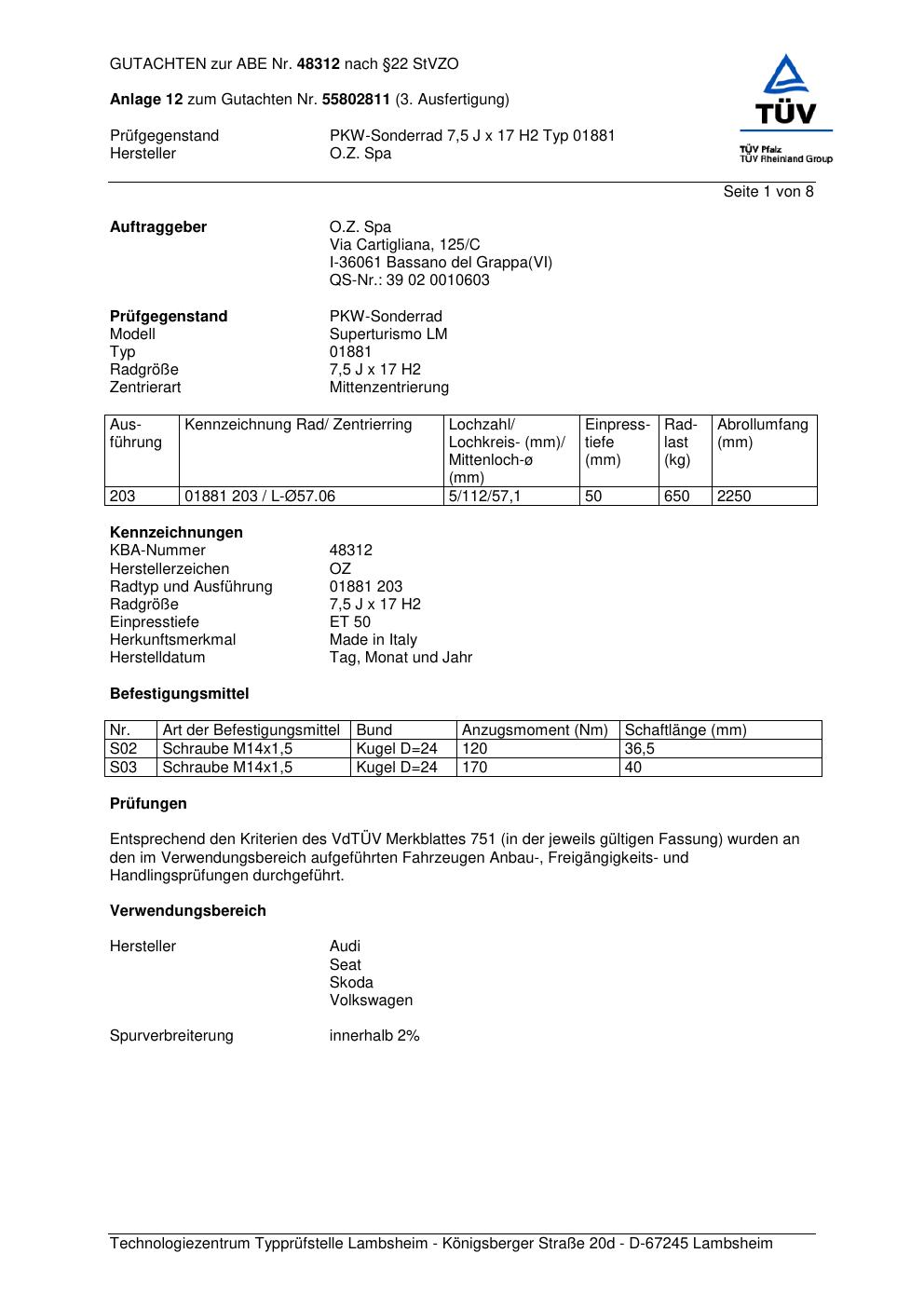 Dieses abe gehört zur Felge O.Z. Racing 0188 1 in ET0 mit KBA 48312. Die Seite ist dafür gedacht, dass du schnell prüfen kannst, ob KBA, Design und Größe zu deiner Felge passen und danach direkt das richtige PDF lädst.