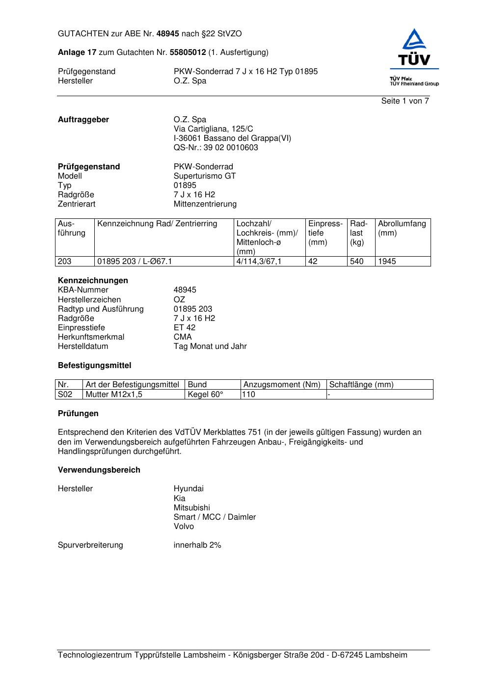 Dieses abe gehört zur Felge O.Z. Racing 01895 in ET0 mit KBA 48945. Die Seite ist dafür gedacht, dass du schnell prüfen kannst, ob KBA, Design und Größe zu deiner Felge passen und danach direkt das richtige PDF lädst.