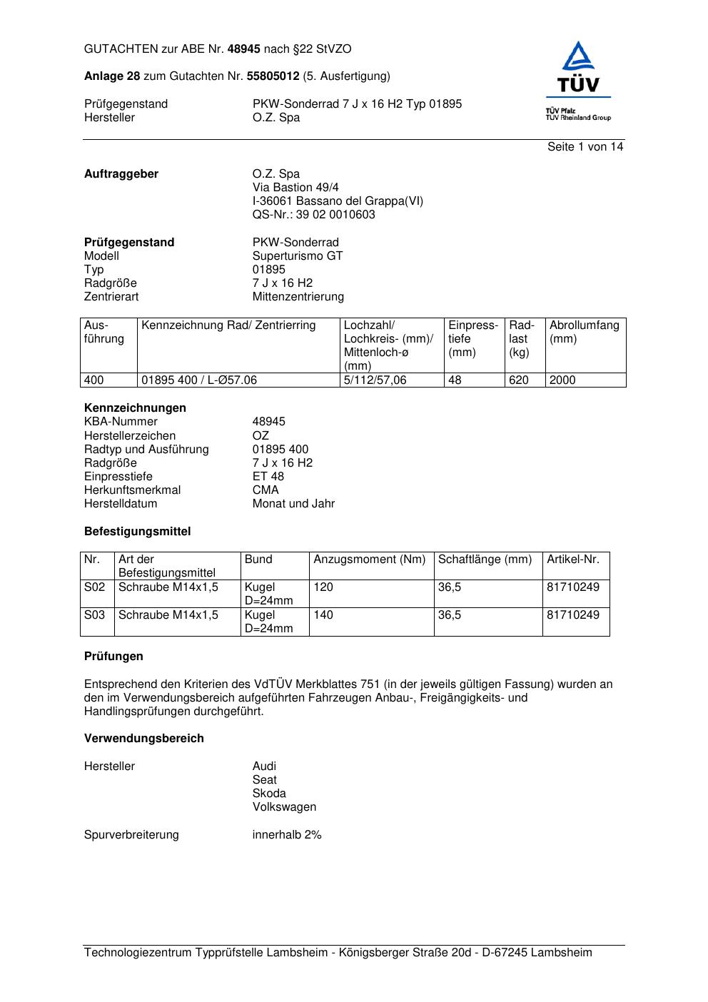 Dieses abe gehört zur Felge O.Z. Racing 01895 in ET0 mit KBA 48945. Die Seite ist dafür gedacht, dass du schnell prüfen kannst, ob KBA, Design und Größe zu deiner Felge passen und danach direkt das richtige PDF lädst.