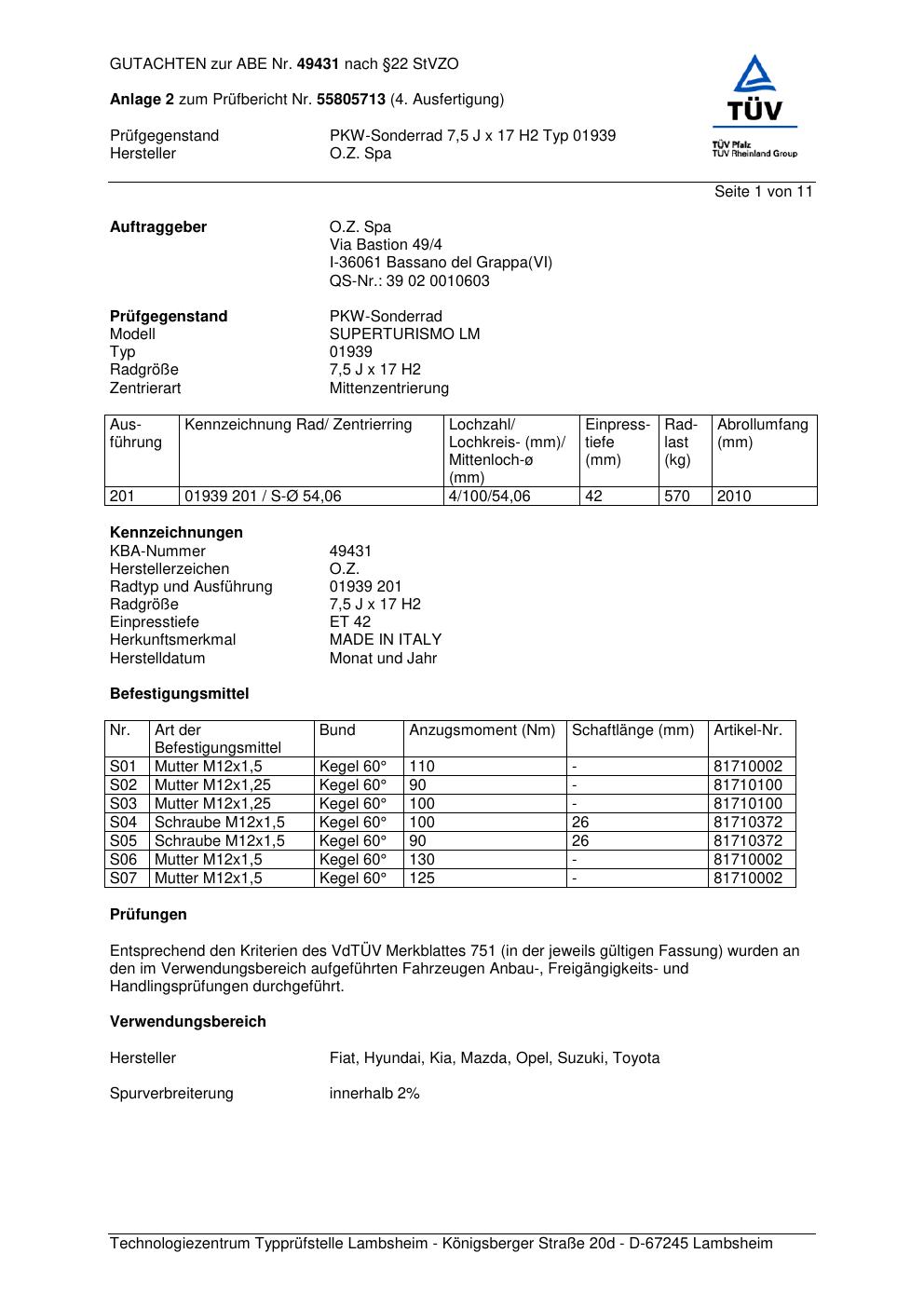 Felgengutachten / abe für Alufelgen O.Z. Spa 0193 9 (ET 0, Mittenloch 0 mm) mit KBA 49431 (Zertifikatsnummer 49431). Hier kostenlos als PDF herunterladen. Der Download-Link ist 24 Stunden gültig und kann bis zu zwei Mal verwendet werden.