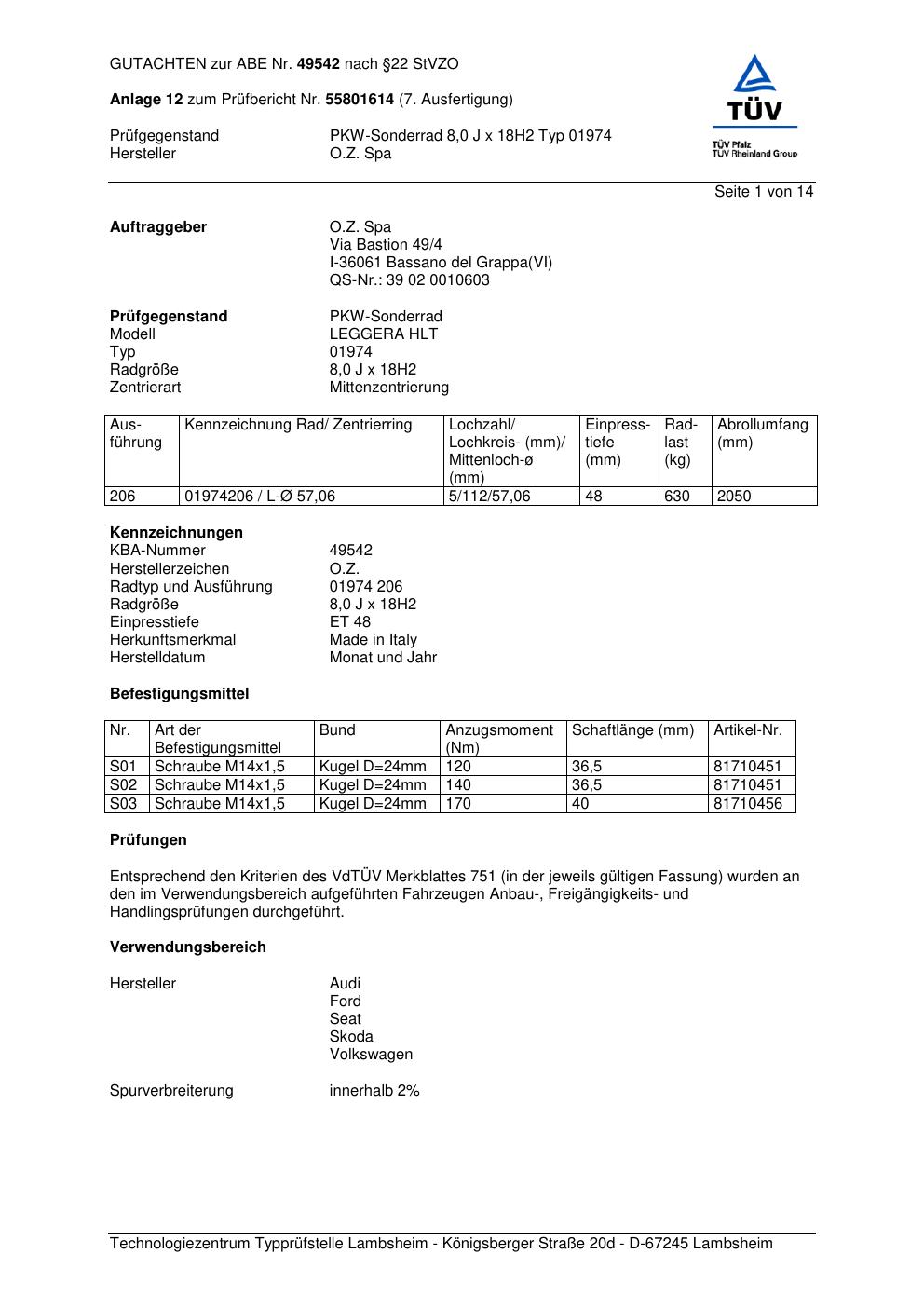 Dieses Gutachten (abe) bezieht sich auf die Alufelge O.Z. Spa 01974 in der Ausführung ET 0, Mittenloch 0 mm (KBA 49542). Im PDF findest du typischerweise zulässige Reifengrößen, Auflagen/Anbauhinweise und – je nach Dokument – Hinweise zur Eintragung.