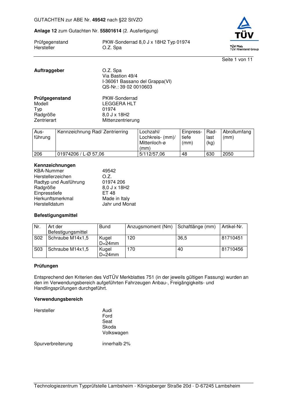 Felgengutachten / abe für Alufelgen O.Z. Spa 01974 (ET 0, Mittenloch 0 mm) mit KBA 49542 (Zertifikatsnummer 49542). Hier kostenlos als PDF herunterladen. Der Download-Link ist 24 Stunden gültig und kann bis zu zwei Mal verwendet werden.