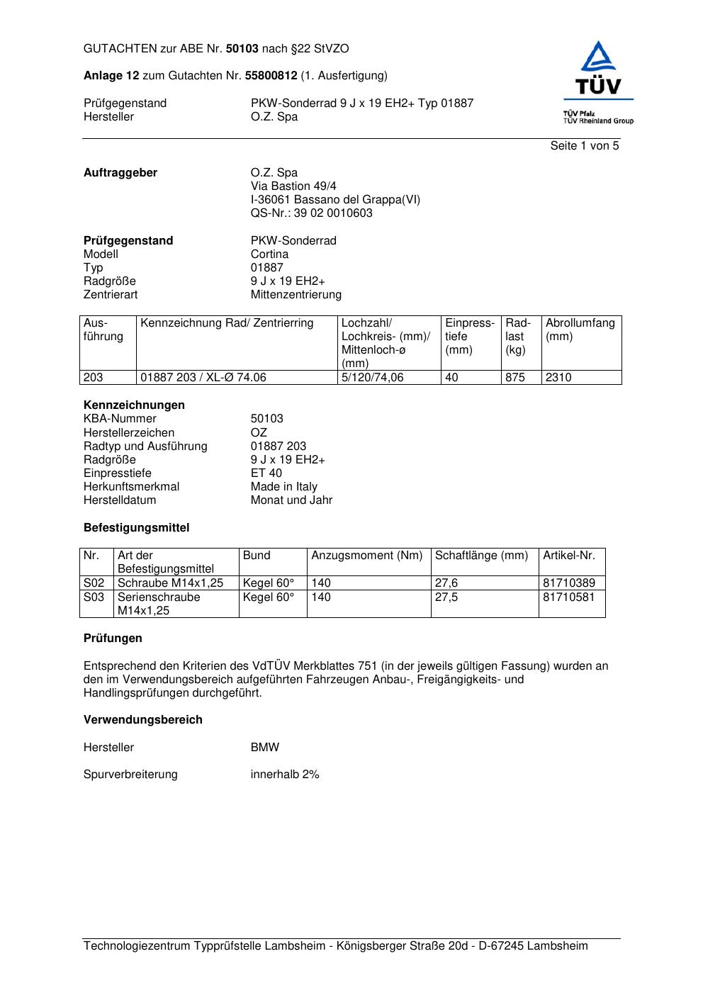 Dieses Gutachten (abe) bezieht sich auf die Alufelge O.Z. Spa 0188 7 in der Ausführung ET 0, Mittenloch 0 mm (KBA 50103). Im PDF findest du typischerweise zulässige Reifengrößen, Auflagen/Anbauhinweise und – je nach Dokument – Hinweise zur Eintragung.