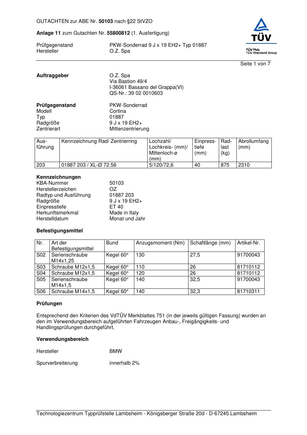 Dieses Gutachten (abe) bezieht sich auf die Alufelge O.Z. Spa 0188 7 in der Ausführung ET 0, Mittenloch 0 mm (KBA 50103). Im PDF findest du typischerweise zulässige Reifengrößen, Auflagen/Anbauhinweise und – je nach Dokument – Hinweise zur Eintragung.