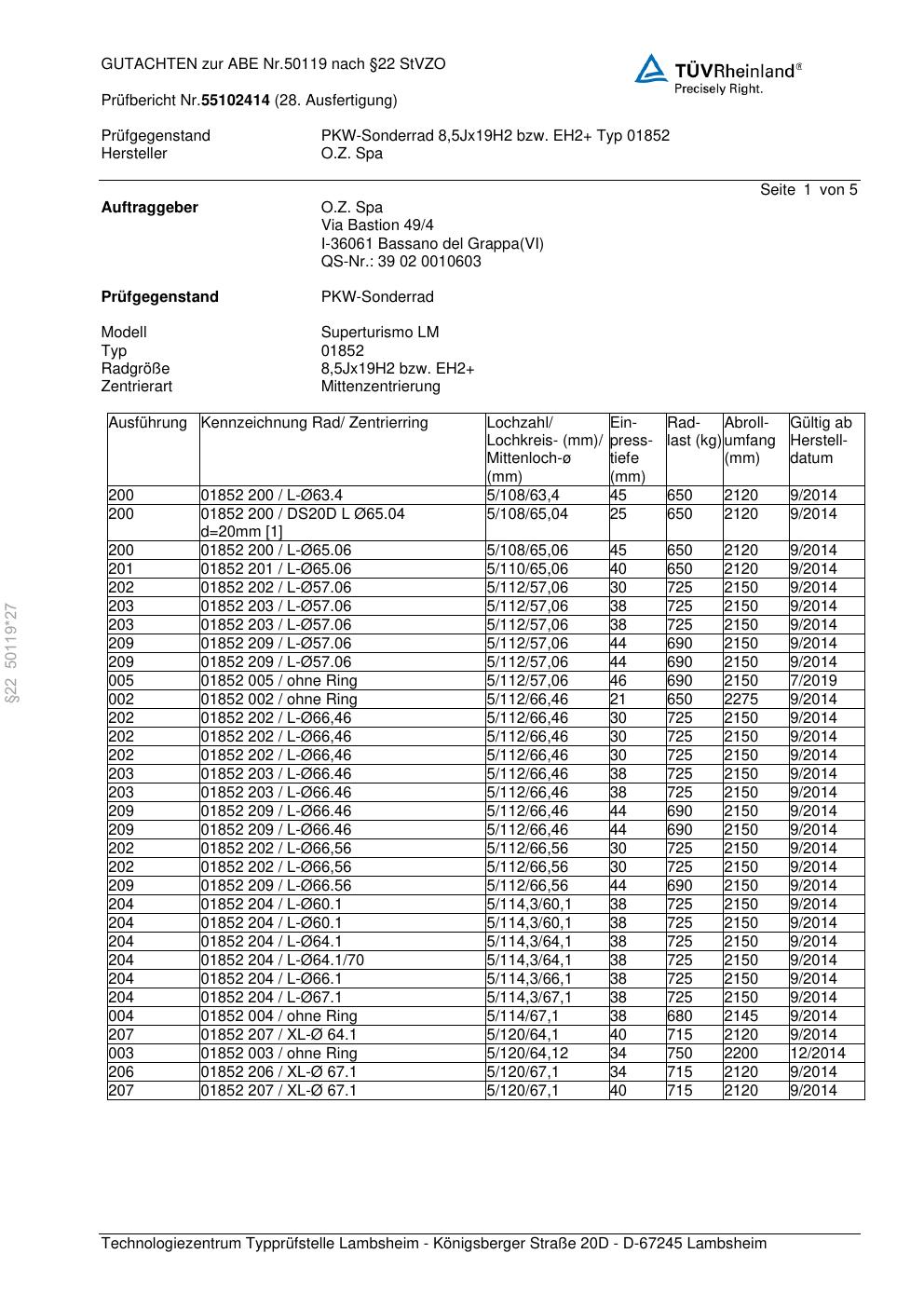 Felgengutachten / abe für Alufelgen O.Z. Spa 01852 (ET 0, Mittenloch 0 mm) mit KBA 50119 (Zertifikatsnummer 50119). Hier kostenlos als PDF herunterladen. Der Download-Link ist 24 Stunden gültig und kann bis zu zwei Mal verwendet werden.