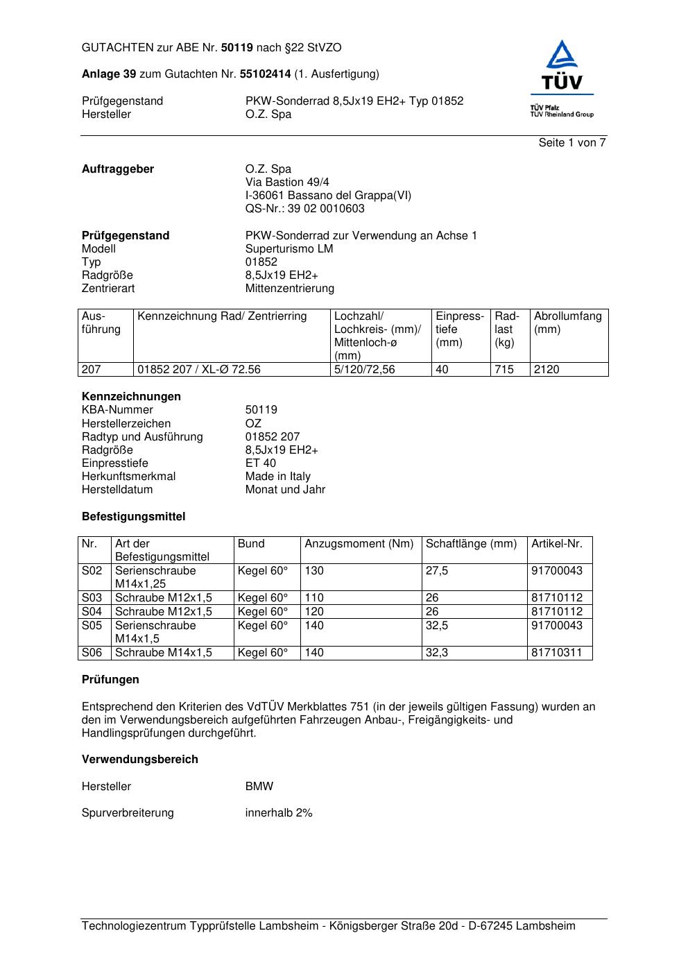 Dieses Gutachten (abe) bezieht sich auf die Alufelge O.Z. Spa 01852 in der Ausführung ET 0, Mittenloch 0 mm (KBA 50119). Im PDF findest du typischerweise zulässige Reifengrößen, Auflagen/Anbauhinweise und – je nach Dokument – Hinweise zur Eintragung.