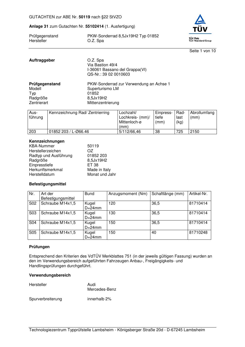 Dieses Gutachten (abe) bezieht sich auf die Alufelge O.Z. Spa 01852 in der Ausführung ET 0, Mittenloch 0 mm (KBA 50119). Im PDF findest du typischerweise zulässige Reifengrößen, Auflagen/Anbauhinweise und – je nach Dokument – Hinweise zur Eintragung.