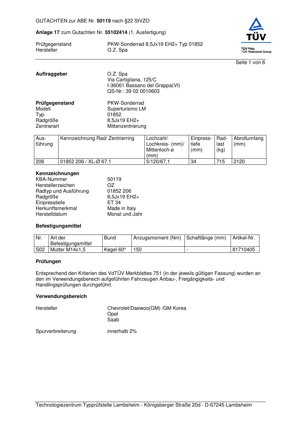 Felgengutachten / abe für Alufelgen O.Z. Spa 01852 (ET 0, Mittenloch 0 mm) mit KBA 50119 (Zertifikatsnummer 50119). Hier kostenlos als PDF herunterladen. Der Download-Link ist 24 Stunden gültig und kann bis zu zwei Mal verwendet werden.