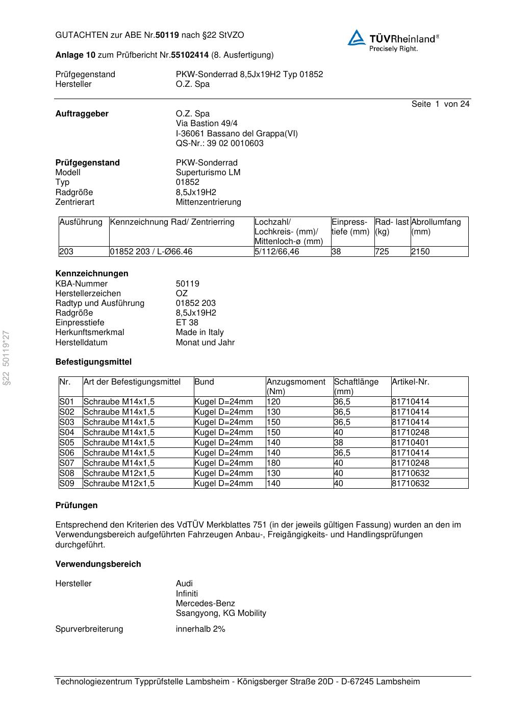 Dieses Gutachten (abe) bezieht sich auf die Alufelge O.Z. Spa 01852 in der Ausführung ET 0, Mittenloch 0 mm (KBA 50119). Im PDF findest du typischerweise zulässige Reifengrößen, Auflagen/Anbauhinweise und – je nach Dokument – Hinweise zur Eintragung.