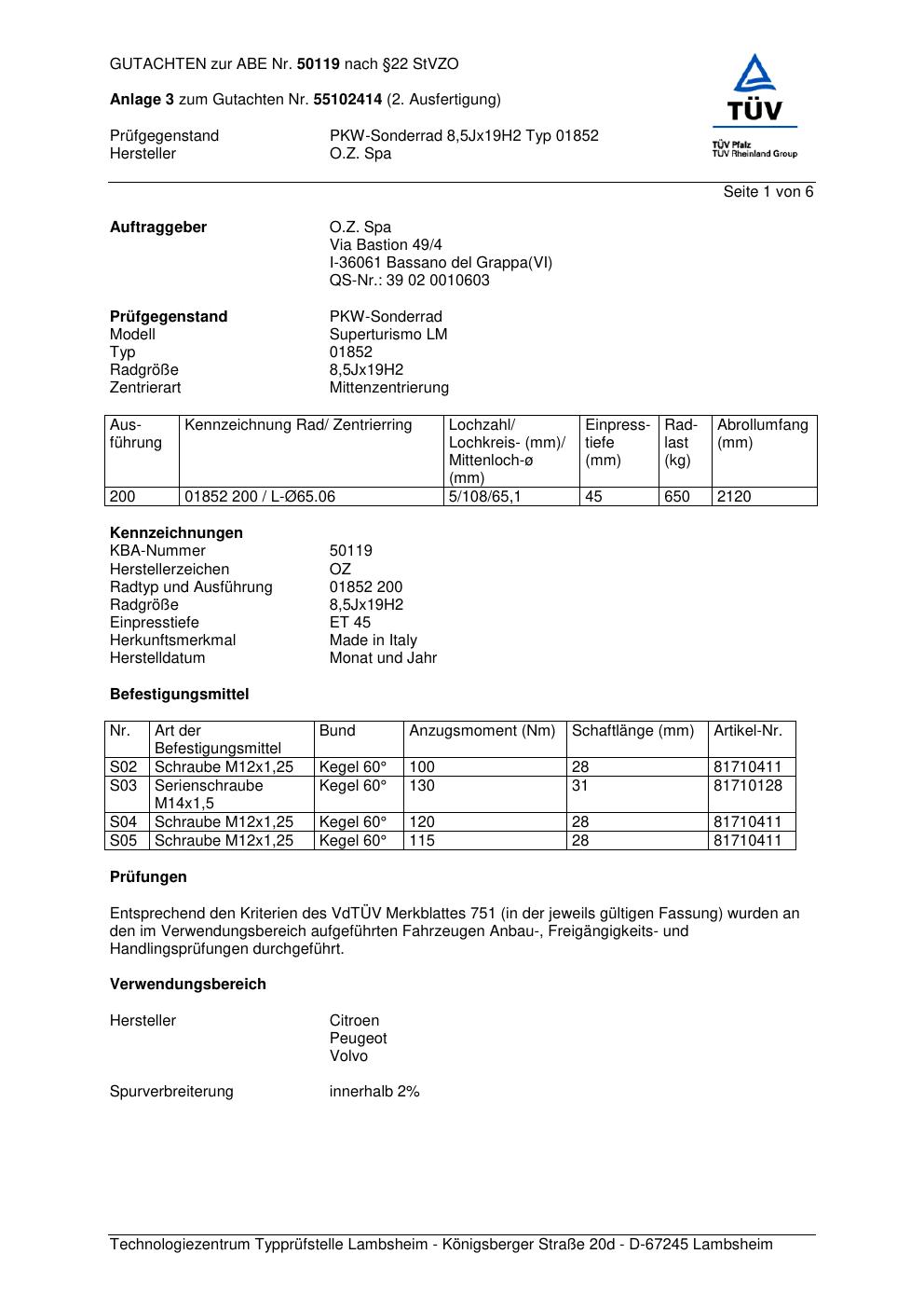Felgengutachten / abe für Alufelgen O.Z. Spa 01852 (ET 0, Mittenloch 0 mm) mit KBA 50119 (Zertifikatsnummer 50119). Hier kostenlos als PDF herunterladen. Der Download-Link ist 24 Stunden gültig und kann bis zu zwei Mal verwendet werden.