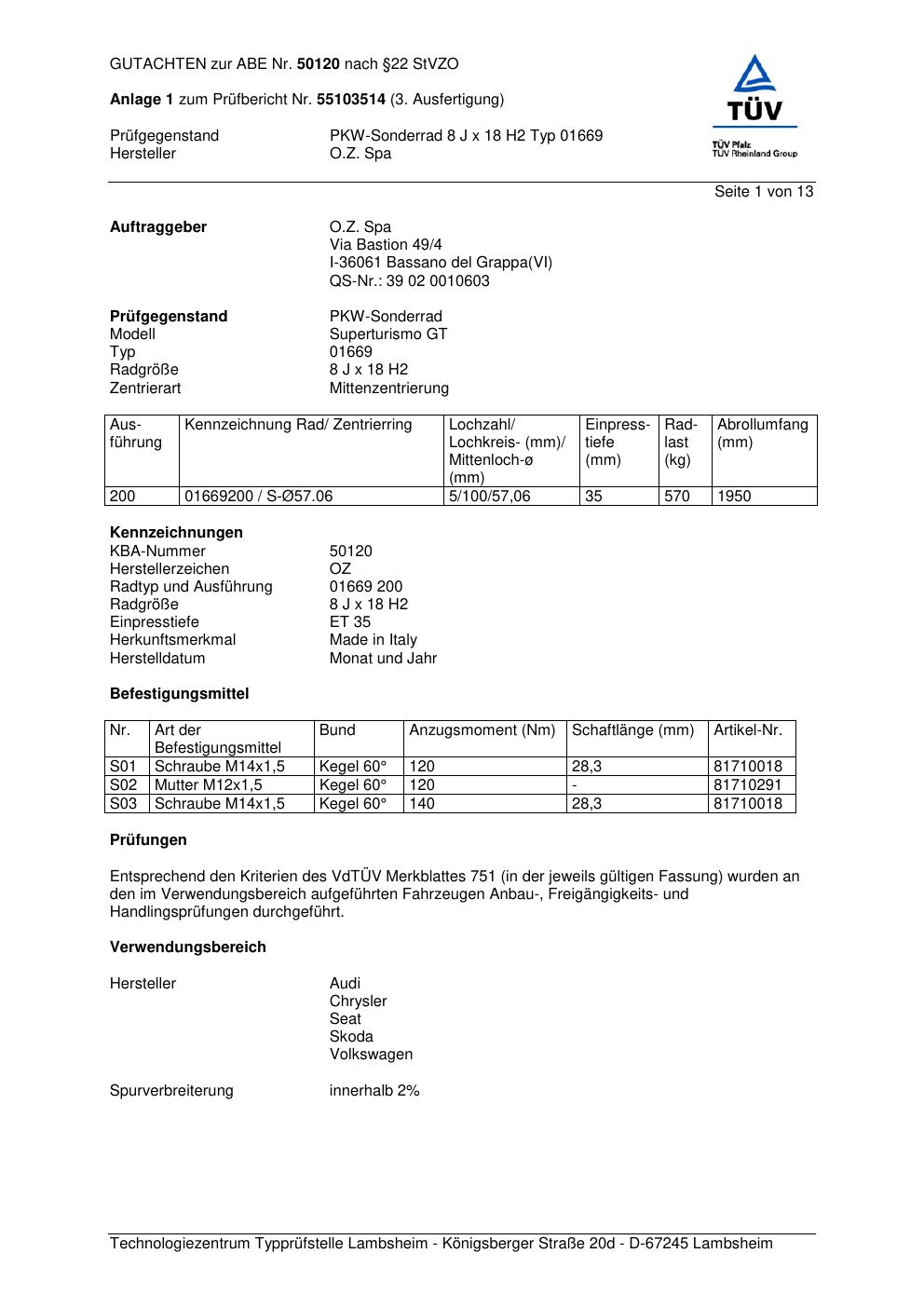 Dieses Gutachten (abe) bezieht sich auf die Alufelge O.Z. Spa 01669 in der Ausführung ET 0, Mittenloch 0 mm (KBA 50120). Im PDF findest du typischerweise zulässige Reifengrößen, Auflagen/Anbauhinweise und – je nach Dokument – Hinweise zur Eintragung.