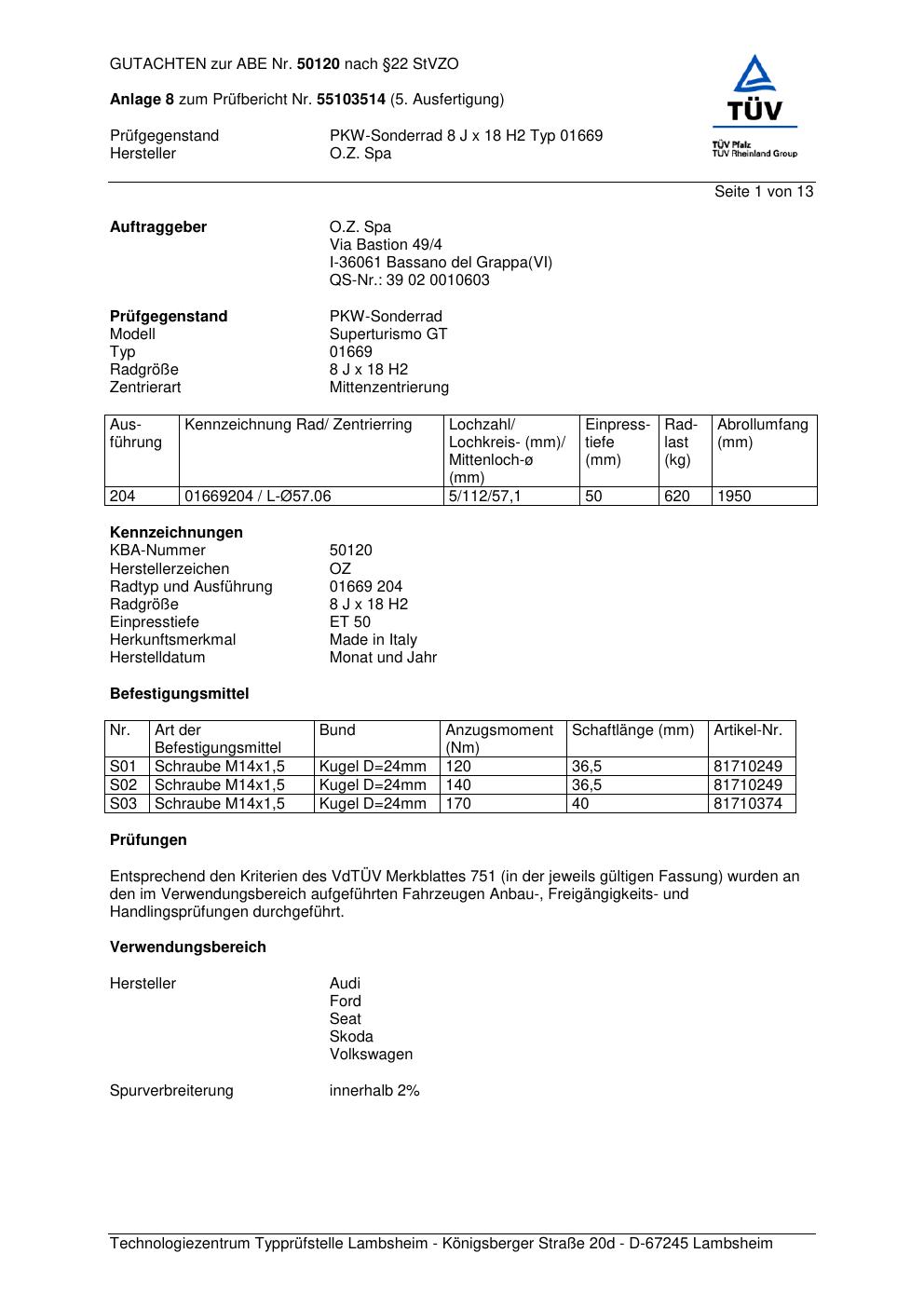 Dieses Gutachten (abe) bezieht sich auf die Alufelge O.Z. Spa 01669 in der Ausführung ET 0, Mittenloch 0 mm (KBA 50120). Im PDF findest du typischerweise zulässige Reifengrößen, Auflagen/Anbauhinweise und – je nach Dokument – Hinweise zur Eintragung.