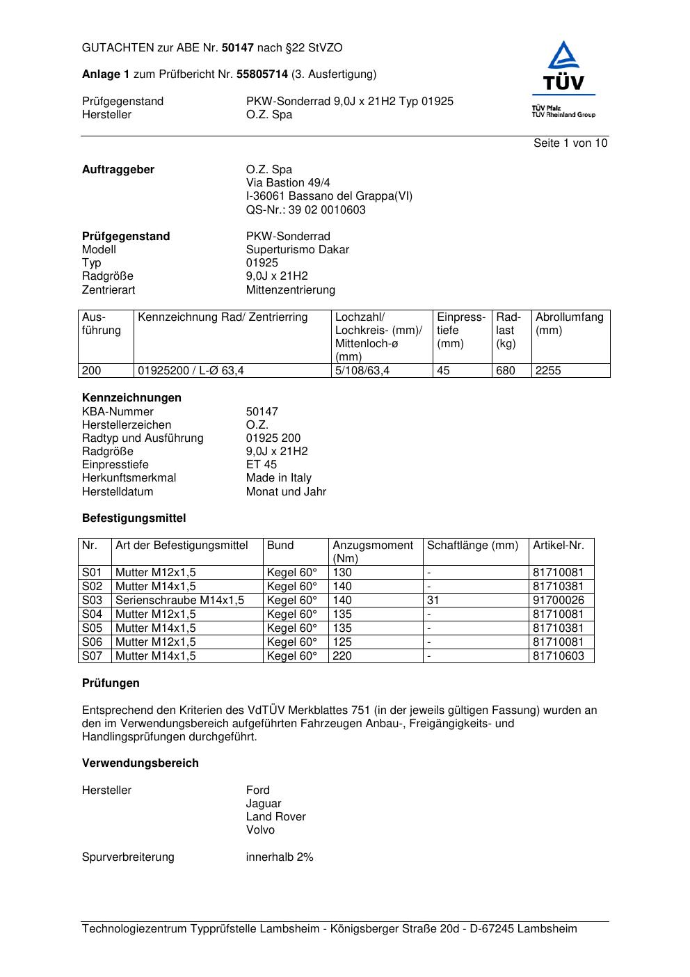 Dieses Gutachten (abe) bezieht sich auf die Alufelge O.Z. Spa 01925 in der Ausführung ET 0, Mittenloch 0 mm (KBA 50147). Im PDF findest du typischerweise zulässige Reifengrößen, Auflagen/Anbauhinweise und – je nach Dokument – Hinweise zur Eintragung.