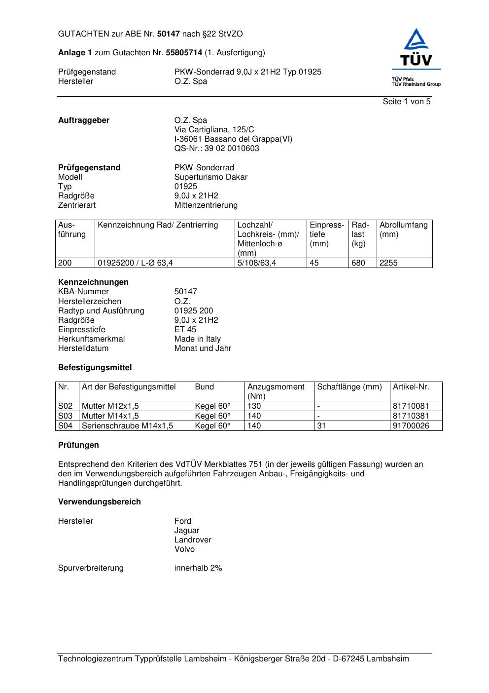 Felgengutachten / abe für Alufelgen O.Z. Spa 01925 (ET 0, Mittenloch 0 mm) mit KBA 50147 (Zertifikatsnummer 50147). Hier kostenlos als PDF herunterladen. Der Download-Link ist 24 Stunden gültig und kann bis zu zwei Mal verwendet werden.