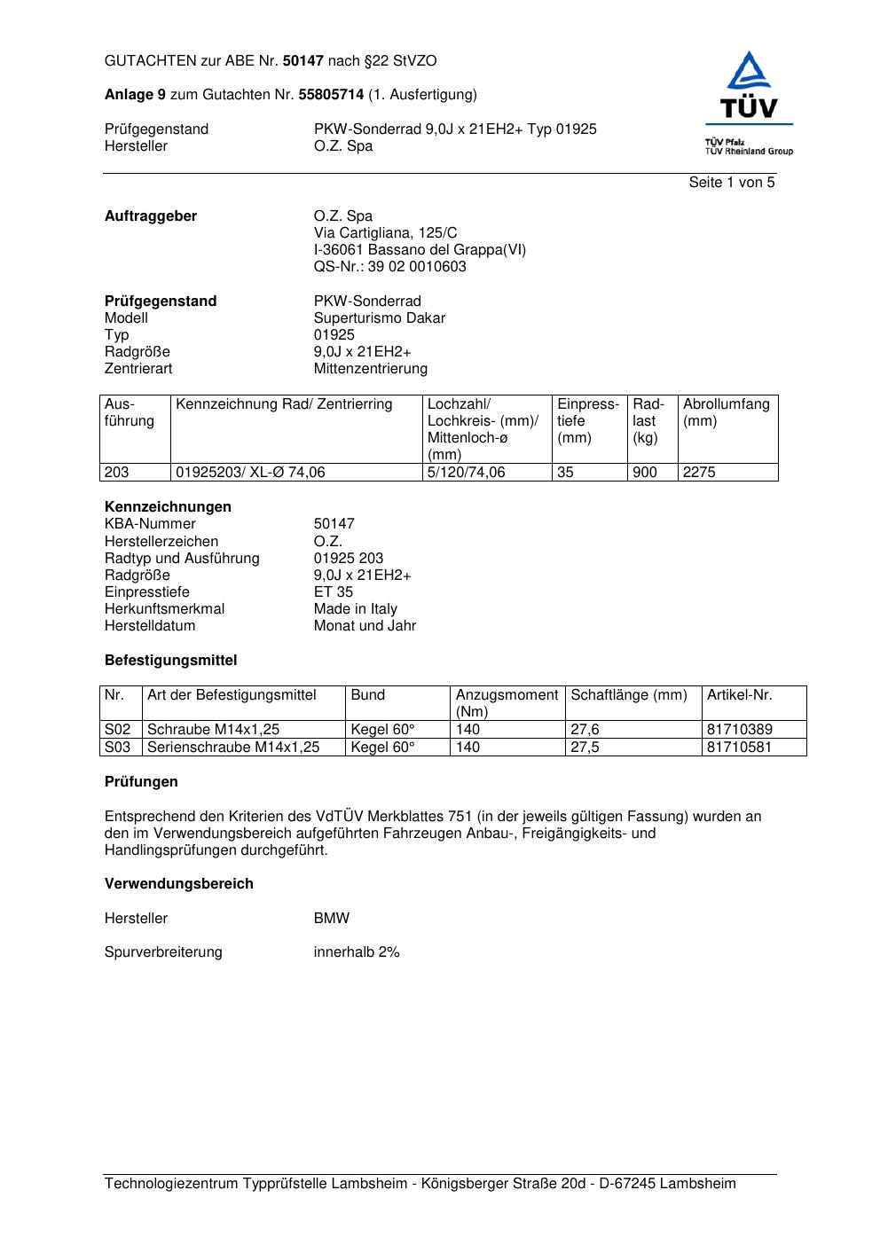 Dieses Gutachten (abe) bezieht sich auf die Alufelge O.Z. Spa 0192 5 in der Ausführung ET 0, Mittenloch 0 mm (KBA 50147). Im PDF findest du typischerweise zulässige Reifengrößen, Auflagen/Anbauhinweise und – je nach Dokument – Hinweise zur Eintragung.