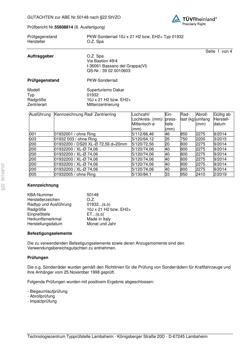 Felgengutachten / abe für Alufelgen O.Z. Spa 01932 (ET 0, Mittenloch 0 mm) mit KBA 50148 (Zertifikatsnummer 50148). Hier kostenlos als PDF herunterladen. Der Download-Link ist 24 Stunden gültig und kann bis zu zwei Mal verwendet werden.