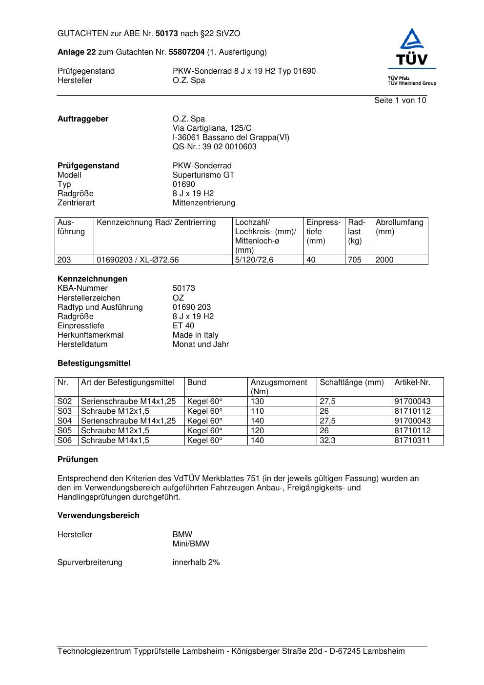 Dieses Gutachten (abe) bezieht sich auf die Alufelge O.Z. Spa 01690 in der Ausführung ET 0, Mittenloch 0 mm (KBA 50173). Im PDF findest du typischerweise zulässige Reifengrößen, Auflagen/Anbauhinweise und – je nach Dokument – Hinweise zur Eintragung.