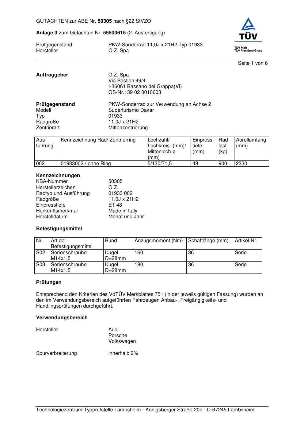Felgengutachten / abe für Alufelgen O.Z. Spa 01933 (ET 0, Mittenloch 0 mm) mit KBA 50305 (Zertifikatsnummer 50305). Hier kostenlos als PDF herunterladen. Der Download-Link ist 24 Stunden gültig und kann bis zu zwei Mal verwendet werden.