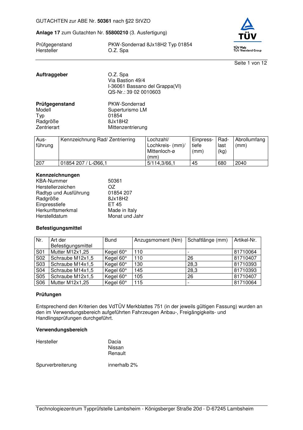 Felgengutachten / abe für Alufelgen O.Z. Spa 01854 (ET 0, Mittenloch 0 mm) mit KBA 50361 (Zertifikatsnummer 50361). Hier kostenlos als PDF herunterladen. Der Download-Link ist 24 Stunden gültig und kann bis zu zwei Mal verwendet werden.
