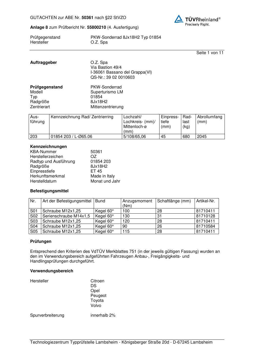 Felgengutachten / abe für Alufelgen O.Z. Spa 01854 (ET 0, Mittenloch 0 mm) mit KBA 50361 (Zertifikatsnummer 50361). Hier kostenlos als PDF herunterladen. Der Download-Link ist 24 Stunden gültig und kann bis zu zwei Mal verwendet werden.