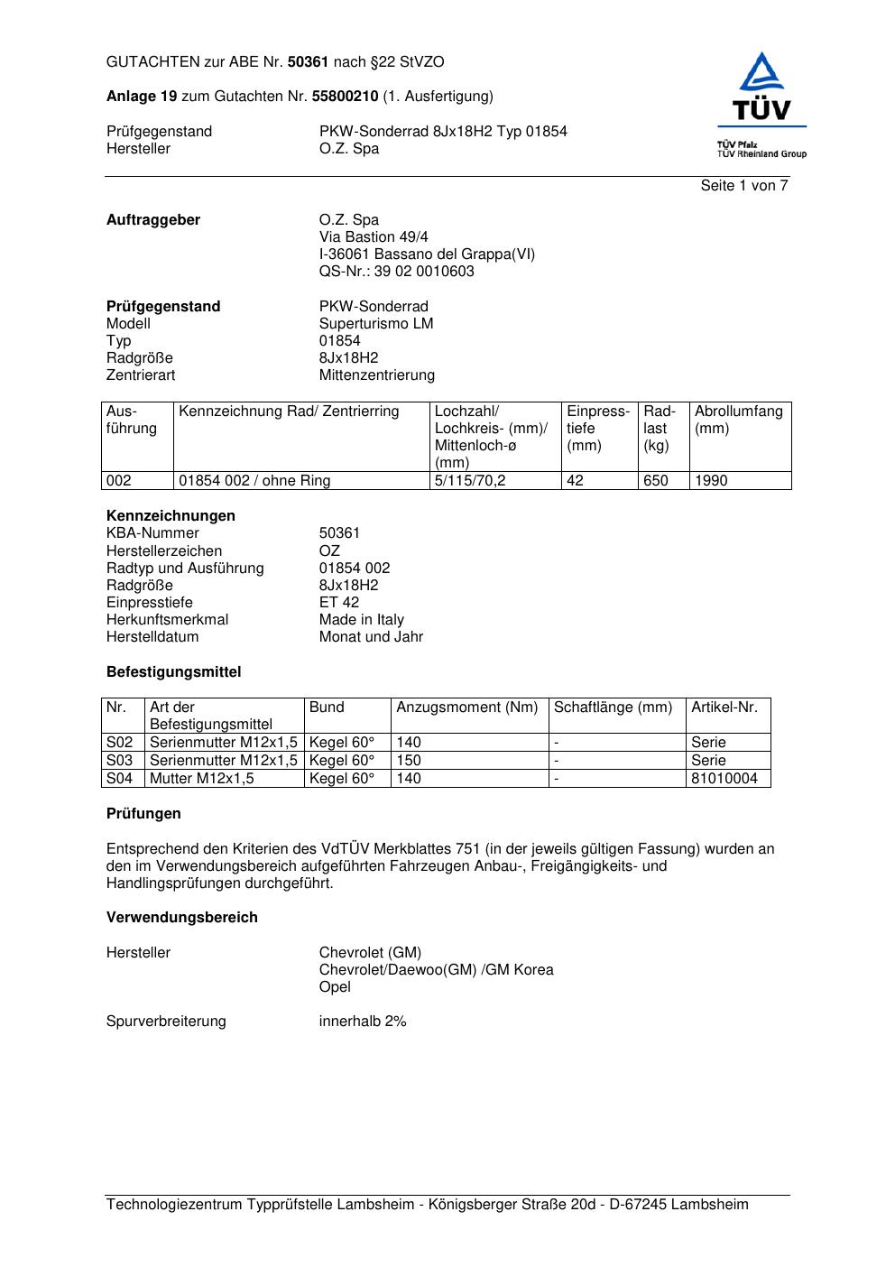 Felgengutachten / abe für Alufelgen O.Z. Spa 01854 (ET 0, Mittenloch 0 mm) mit KBA 50361 (Zertifikatsnummer 50361). Hier kostenlos als PDF herunterladen. Der Download-Link ist 24 Stunden gültig und kann bis zu zwei Mal verwendet werden.