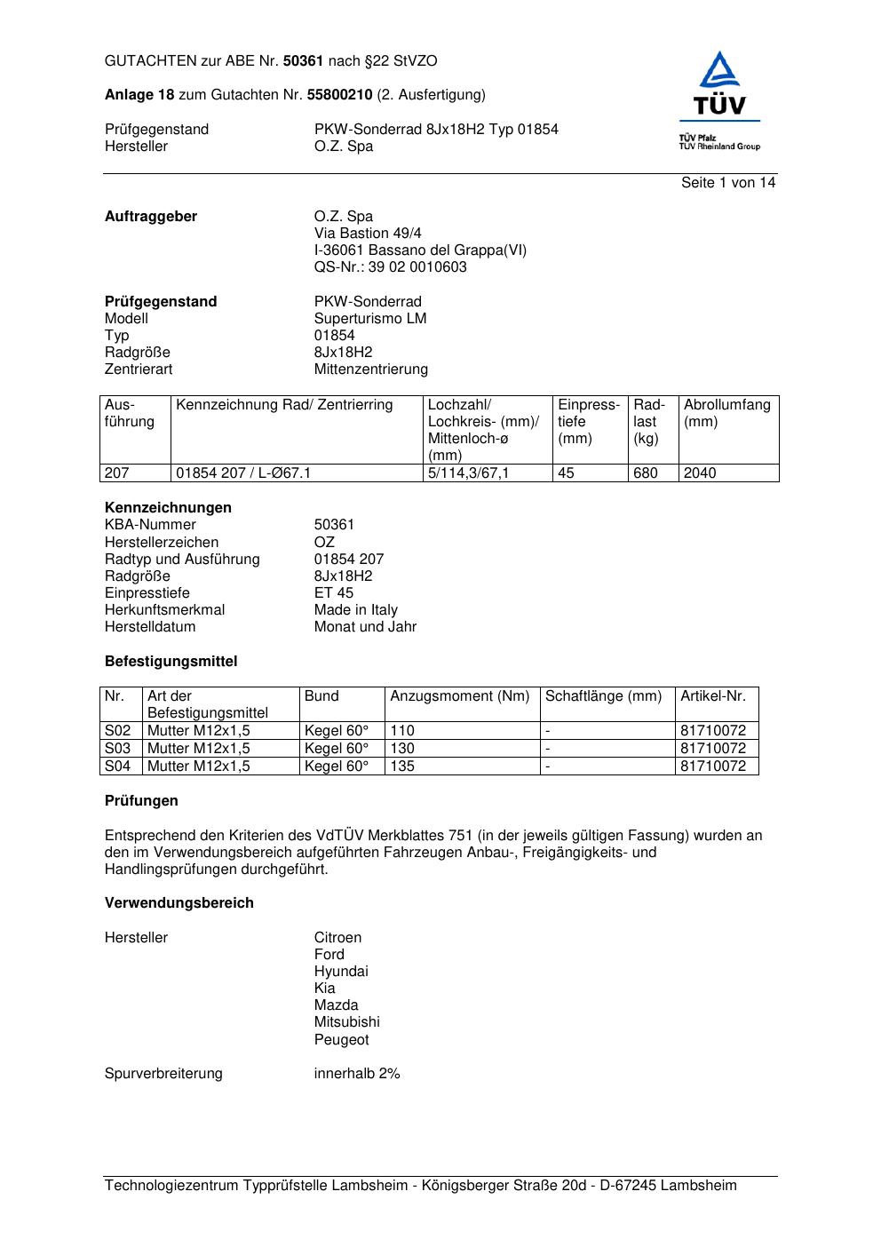 Felgengutachten / abe für Alufelgen O.Z. Spa 01854 (ET 0, Mittenloch 0 mm) mit KBA 50361 (Zertifikatsnummer 50361). Hier kostenlos als PDF herunterladen. Der Download-Link ist 24 Stunden gültig und kann bis zu zwei Mal verwendet werden.