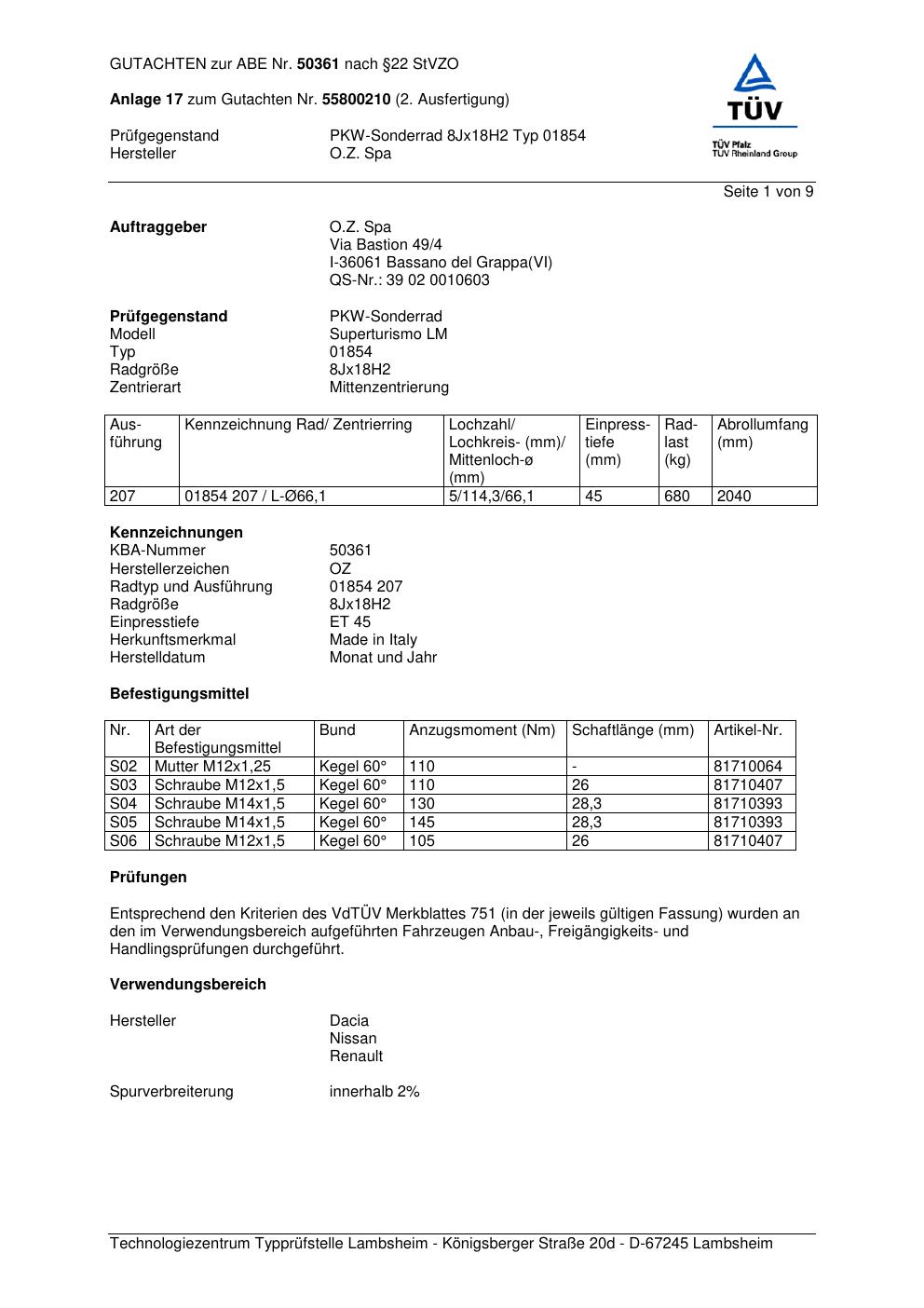 Felgengutachten / abe für Alufelgen O.Z. Spa 01854 (ET 0, Mittenloch 0 mm) mit KBA 50361 (Zertifikatsnummer 50361). Hier kostenlos als PDF herunterladen. Der Download-Link ist 24 Stunden gültig und kann bis zu zwei Mal verwendet werden.