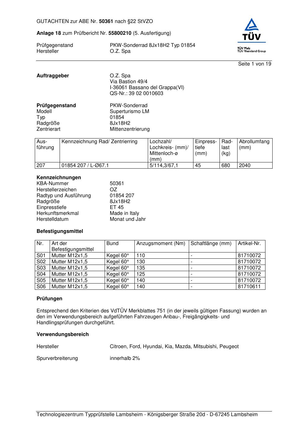 Felgengutachten / abe für Alufelgen O.Z. Spa 01854 (ET 0, Mittenloch 0 mm) mit KBA 50361 (Zertifikatsnummer 50361). Hier kostenlos als PDF herunterladen. Der Download-Link ist 24 Stunden gültig und kann bis zu zwei Mal verwendet werden.