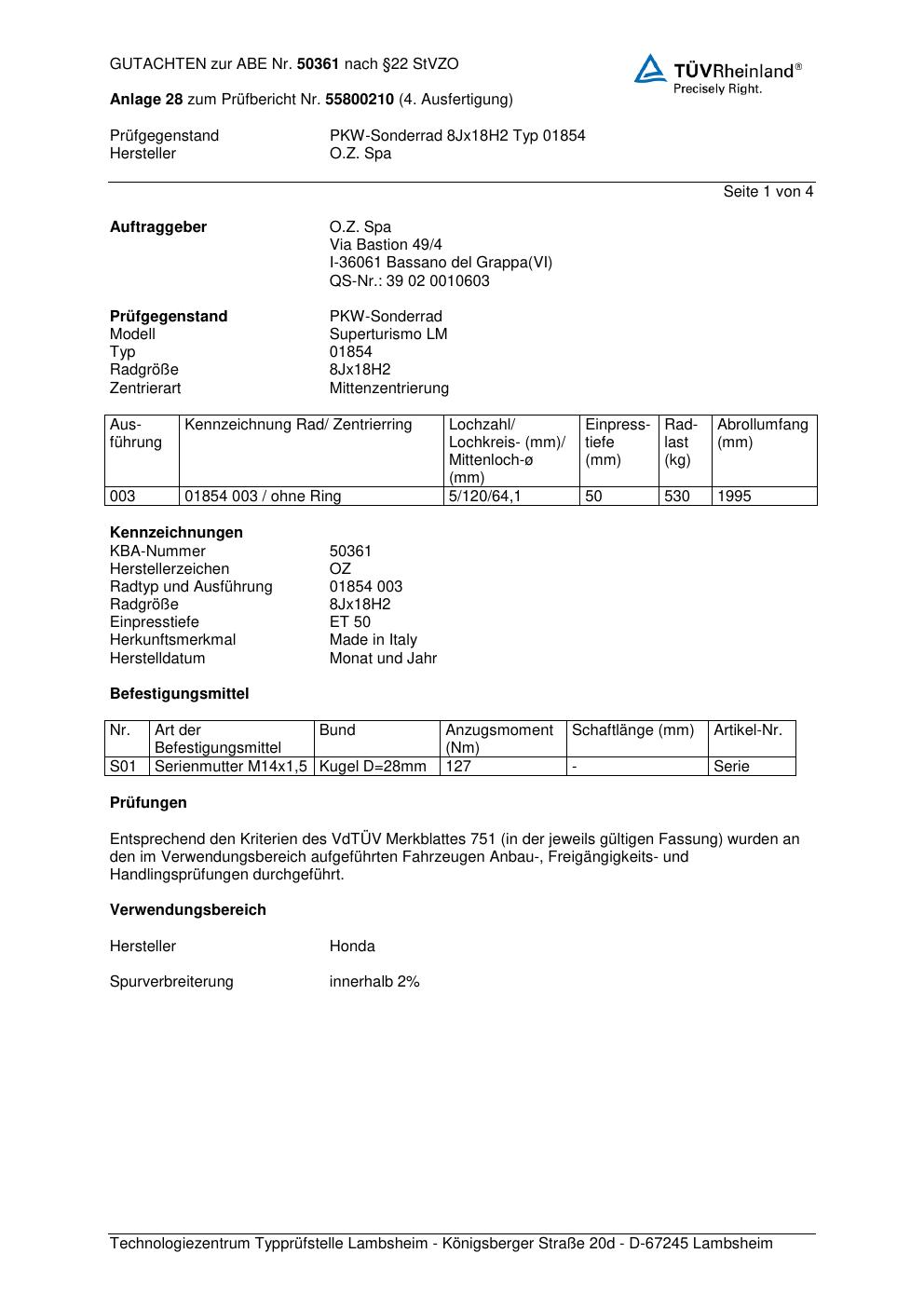 Felgengutachten / abe für Alufelgen O.Z. Spa 01854 (ET 0, Mittenloch 0 mm) mit KBA 50361 (Zertifikatsnummer 50361). Hier kostenlos als PDF herunterladen. Der Download-Link ist 24 Stunden gültig und kann bis zu zwei Mal verwendet werden.